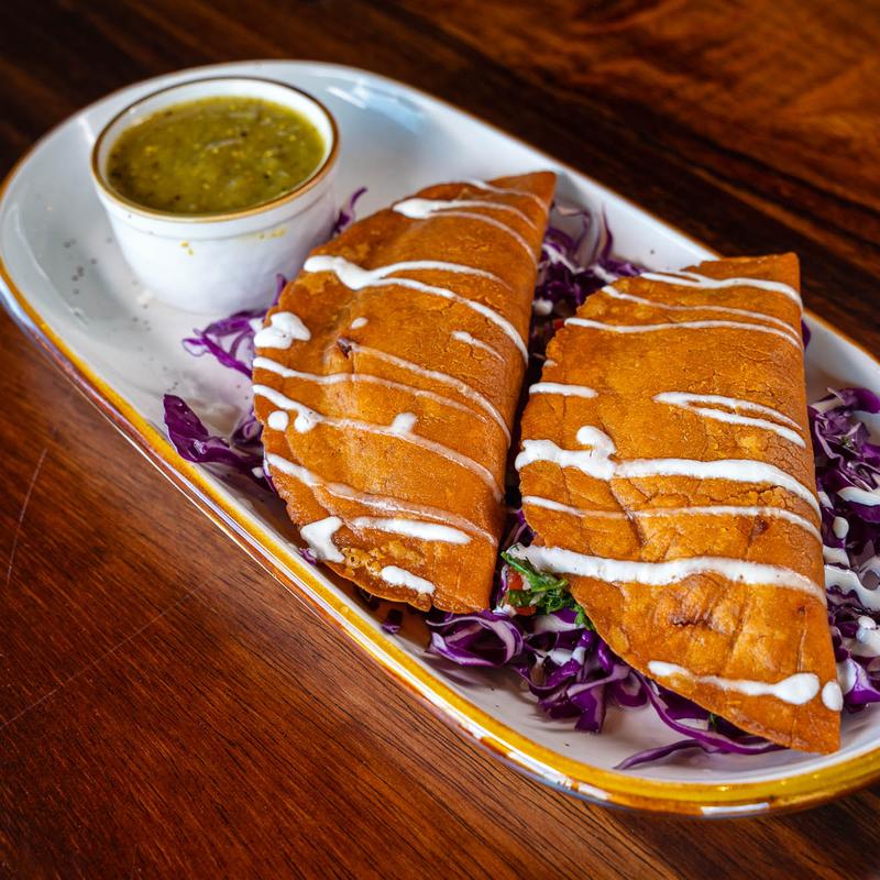 Three corn tortillas filled with potato mix and deep fried. Served with guacamole salad and black beans.